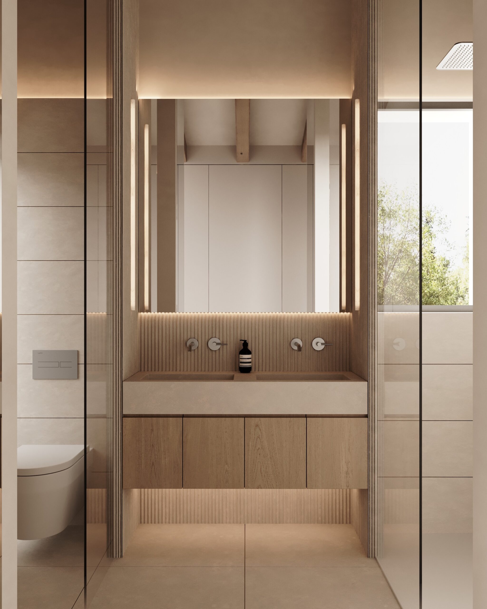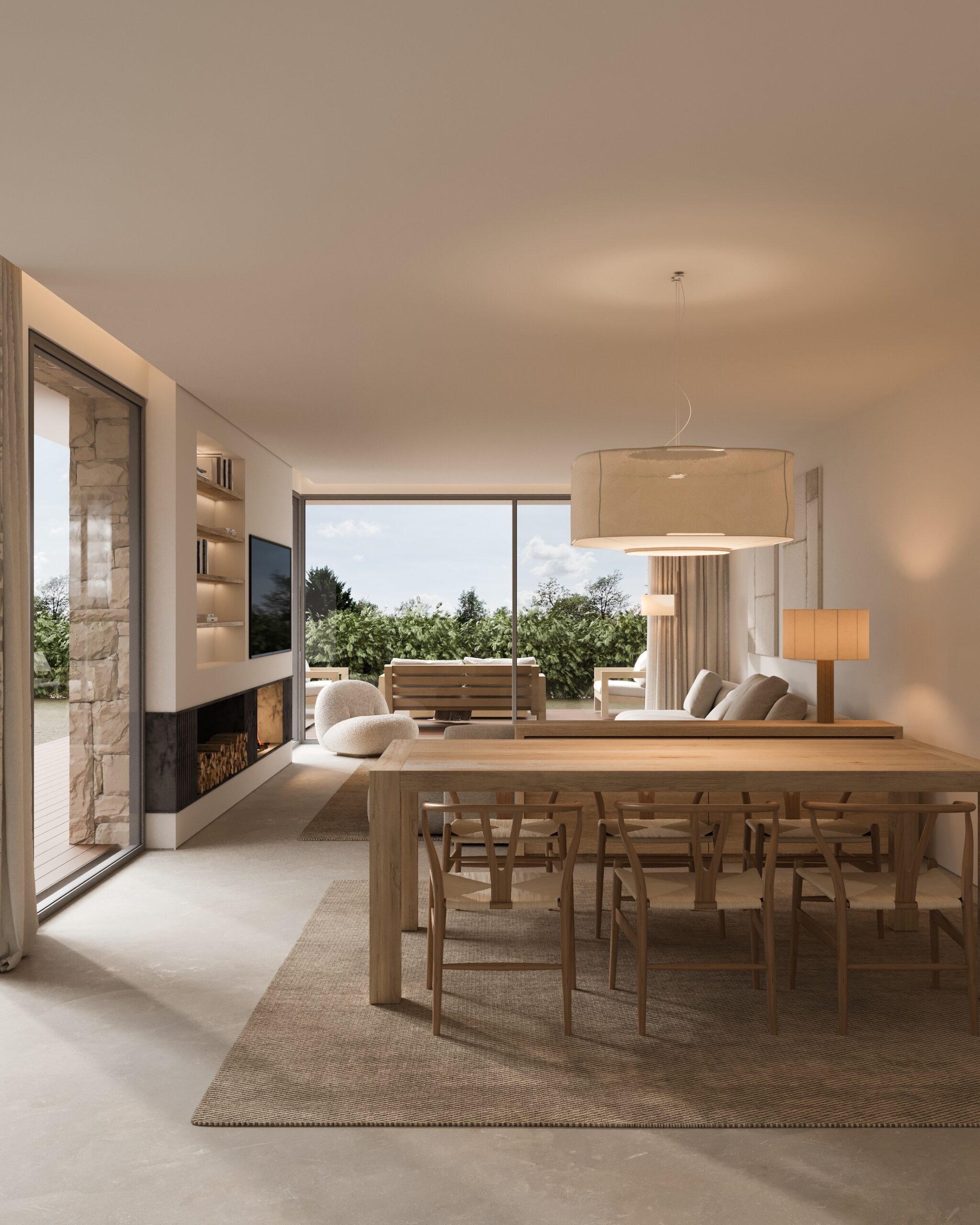 A l’interior, la distribució fluïda afavoreix el diàleg entre dins i fora. L’element central és la torre de la llar de foc i barbacoa, veritable epicentre del programa: al seu voltant s’organitza i es connecta tota la planta baixa, actuant com a ròtula entre espais i com a punt de relació amb l’exterior.