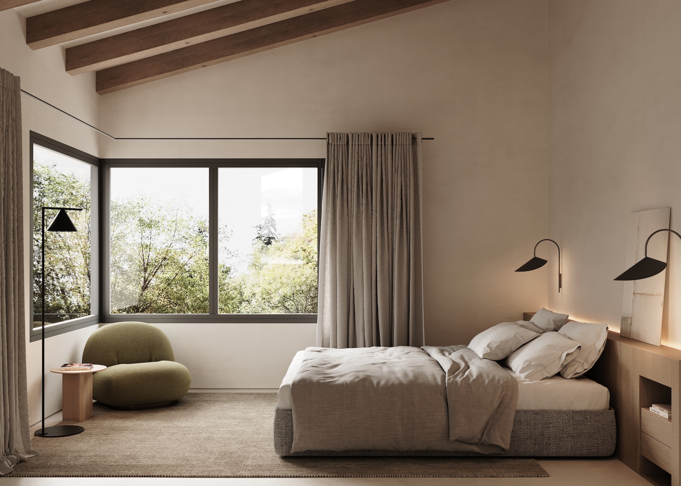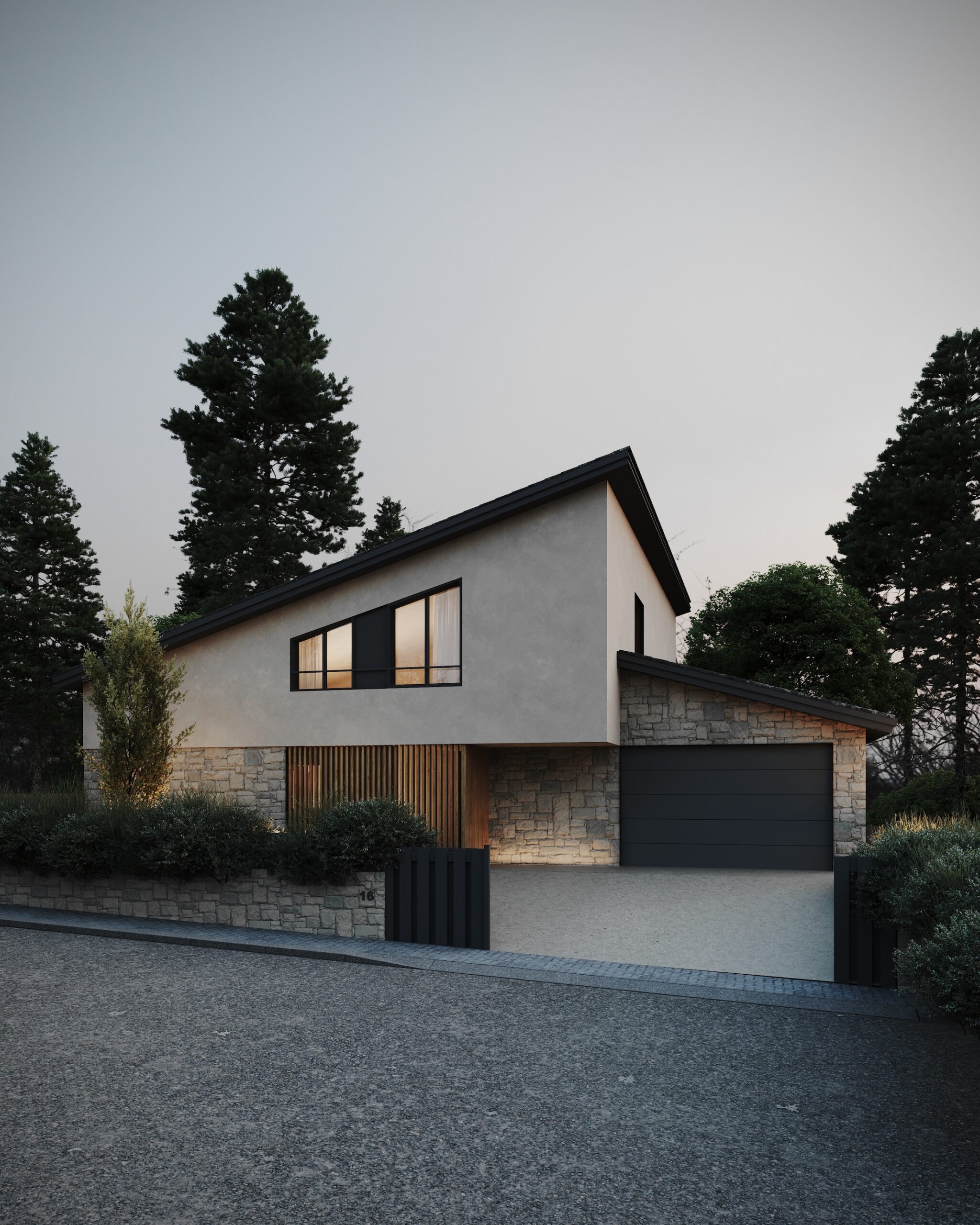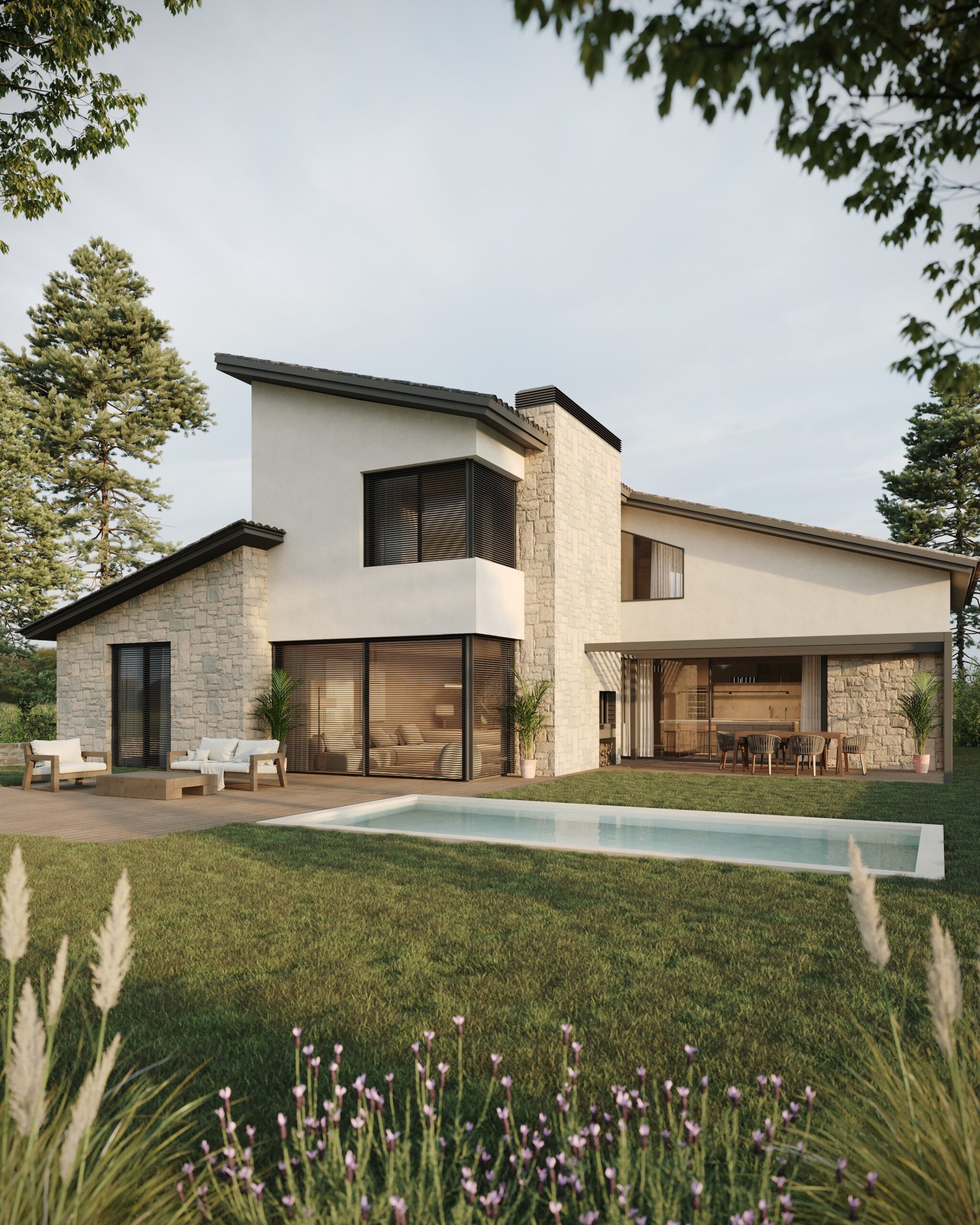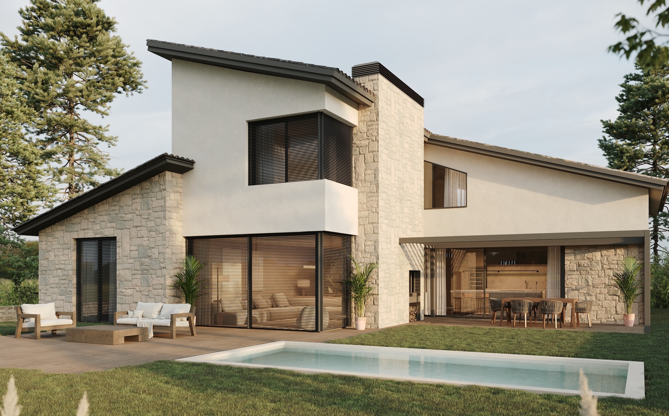 El projecte combina tres materials principals —pedra, fusta i SATE— que s’articulen de manera harmònica amb l’entorn. La coberta inclinada i els materials emprats recuperen l’essència de la tradició local i de la masia catalana, reinterpretada amb un llenguatge actual.